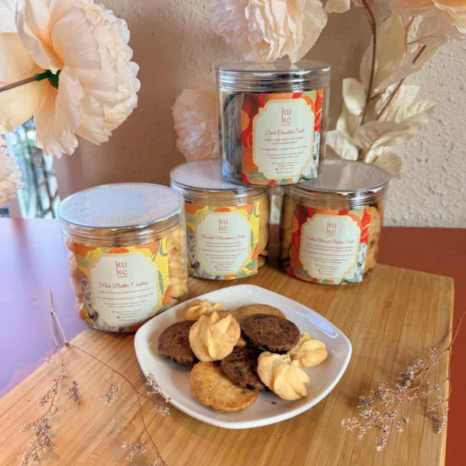 - 2 Festive Cookies jars of your choice ( choice of Toasted Macadamia Sable Cookies, Dark Chocolate Sable Cookies, Salted Almond Praline Sable Cookies and Pure Butter Cookies)