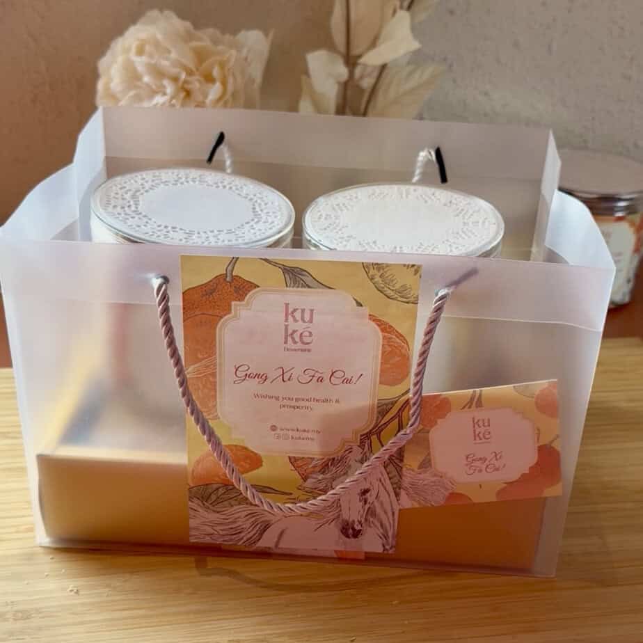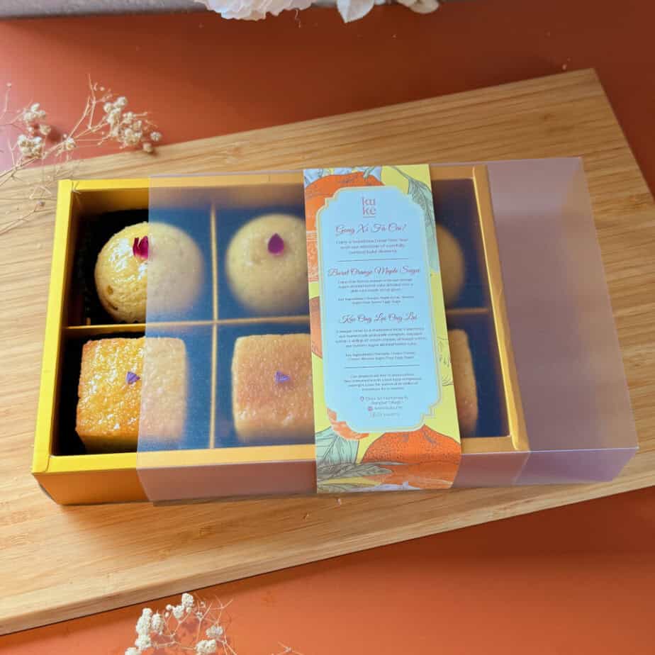 - 6 piece combo Gift Box which includes 3 Orange Maple Sugee and 3 Kue Ong Lai Sugee cakes