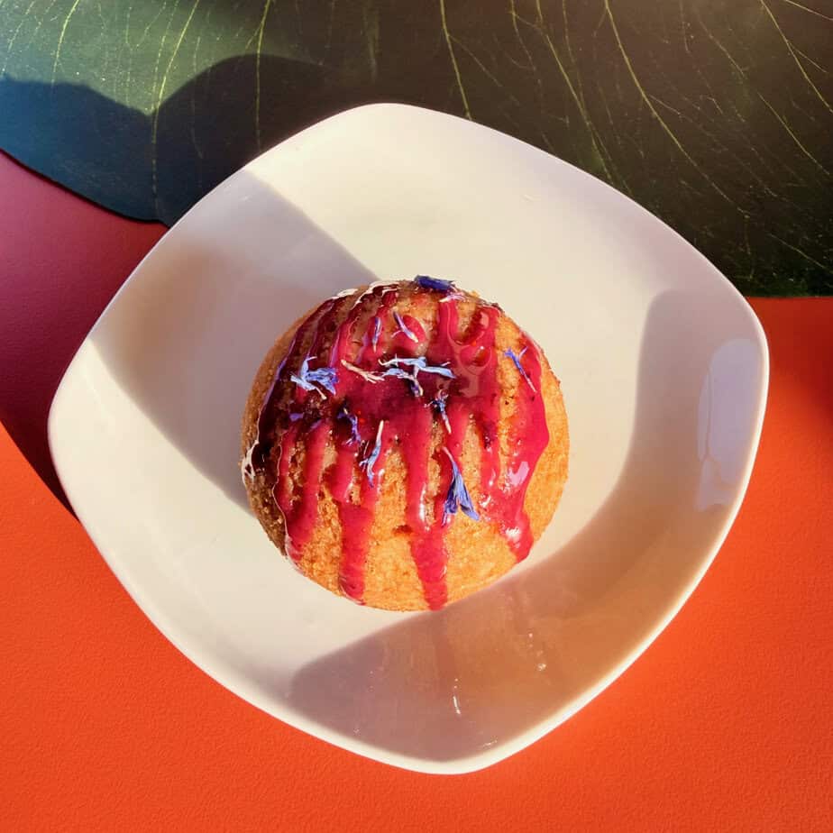 Delightfully spiced gula merah almond sugee butter cake with juicy blueberry jam morsels.