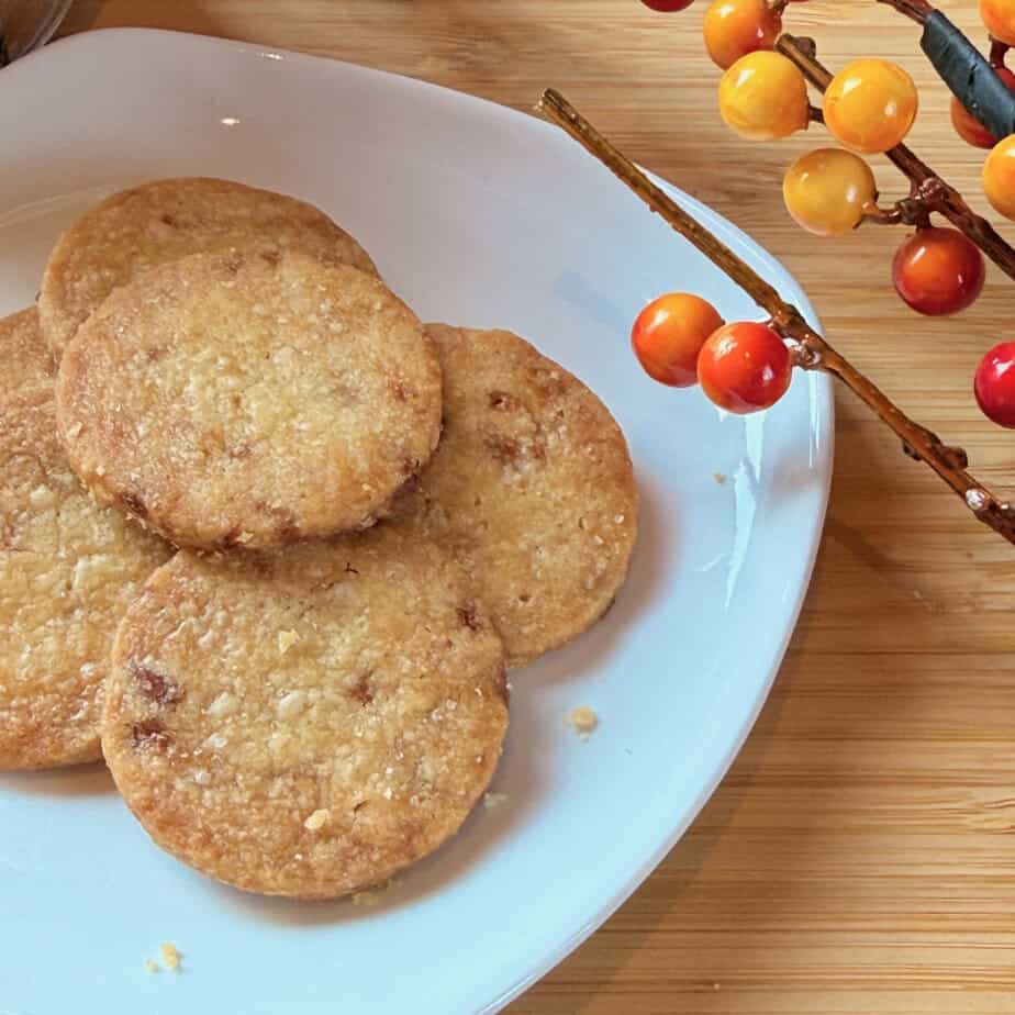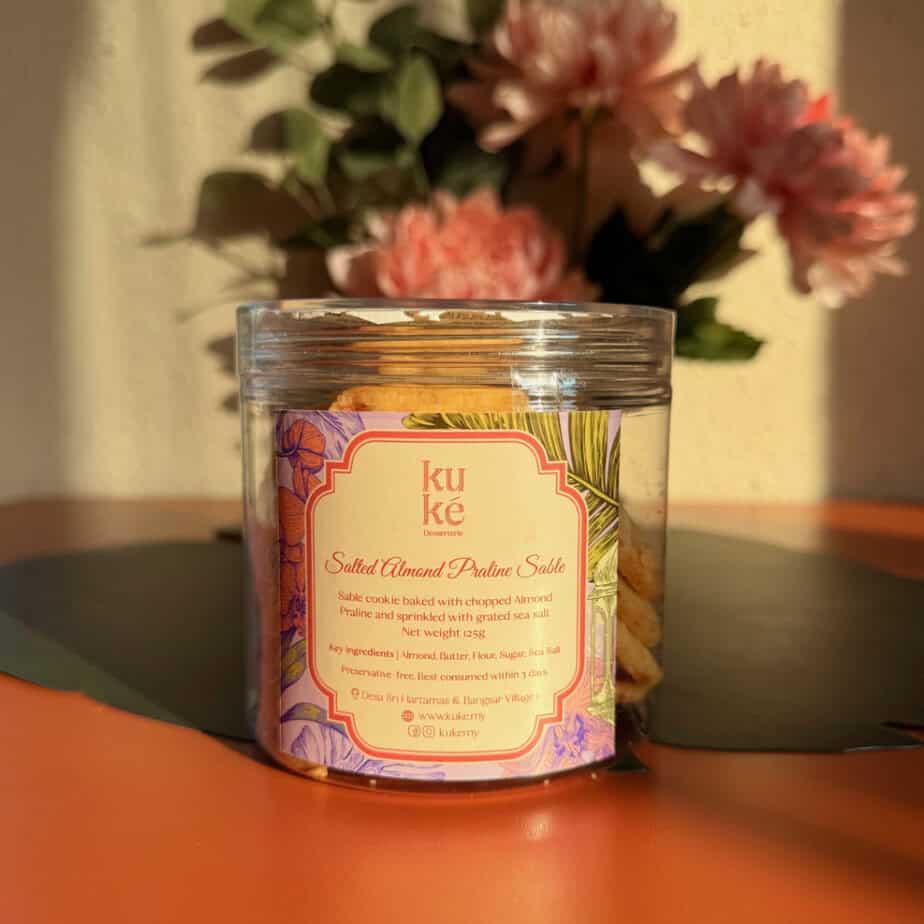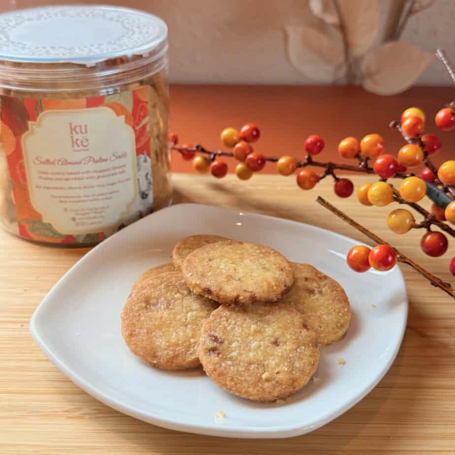 Sable cookie with chopped Almond Praline and sprinkled with grated sea salt to give you pops of sweet nuttiness and saltiness.