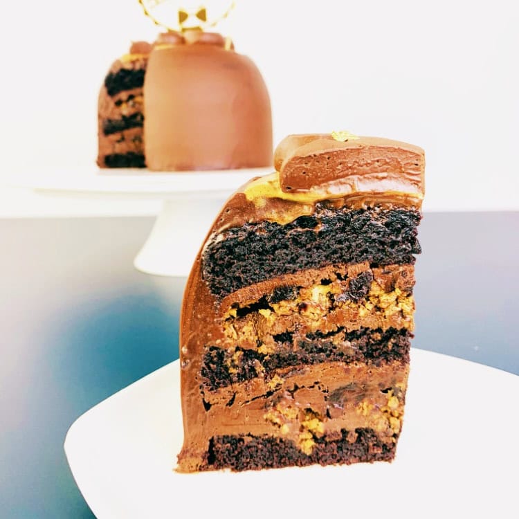 Inspired by the Korean craze #dalgonacoffeechallenge we created our very own Dalgona chocolate cake with extra goodies. Our signature moist chocolate cake loaded with fudgy dark brownies and chunks of Callebaut Gold caramel almond praline crunch and infused with shots of Davidoff Espresso inspired Dalgona cream. Dark and chocolatey.